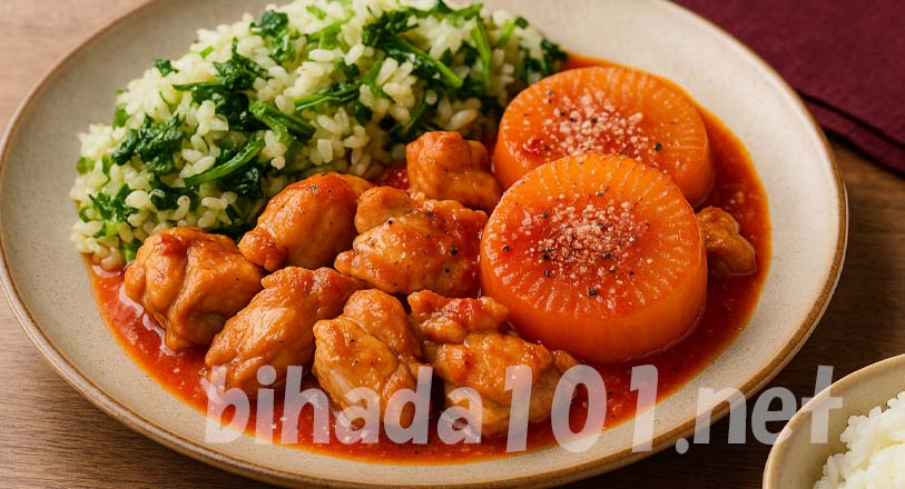 大根に鶏肉のうまみがしっかり染み込み、トマトの酸味で煮込みなのに軽やかな味わいです。バターご飯との相性が抜群で、食卓が一気に華やかになる一品でした。