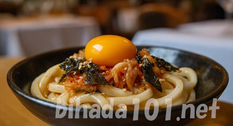 レンジで解凍した冷凍うどんに、めんつゆとごま油、キムチや卵黄を合わせるだけなのに、コクと旨みがしっかり感じられる一品でした。キムチの辛みと発酵の風味が、もっちりとしたさぬきうどんと相性抜群で、卵黄が全体をまろやかにまとめてくれます。ごま油とごま、焼きのりのおかげで香りも良く、夜食や忙しい日の一人ごはんにもぴったりな時短アレンジだと思いました。