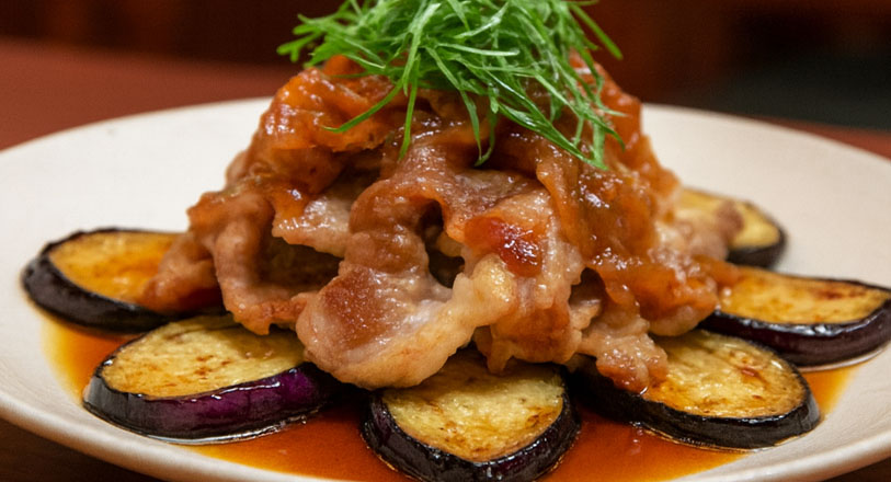 - ナスと豚バラ肉を器に盛り付け、梅だれをかけて大葉をのせたら完成です。
