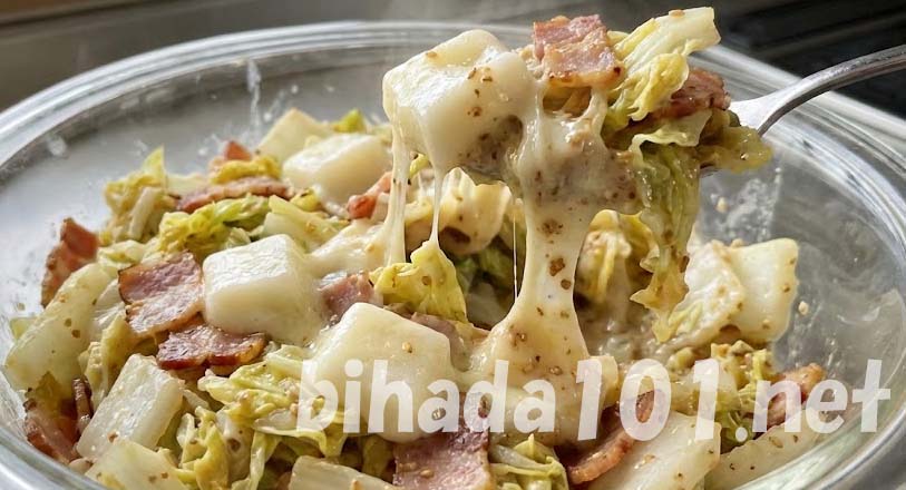 - 3センチ角にカットしたお餅とベーコンを2のボウルに入れ、その上から残りの白菜を全て重ねます。