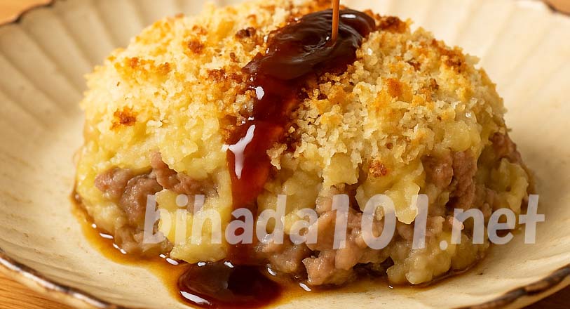 - 加熱した具材をつぶしたじゃがいもと混ぜ合わせ、耐熱グラタン皿に入れます。