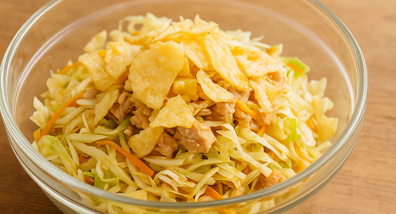 とても手軽に作れるのに、ツナの旨みとポテトチップスのカリカリ食感がアクセントになり、やみつきになる美味しさでした。しょうゆの風味が全体をまとめてくれるので、さっぱりとしながらもコクのあるサラダに仕上がります。忙しい時やおつまみにもぴったりな一品です。