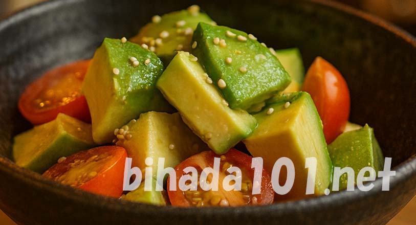 - アボカドは種を取り、皮をむいて一口大にカットし、ボウルに入れます。