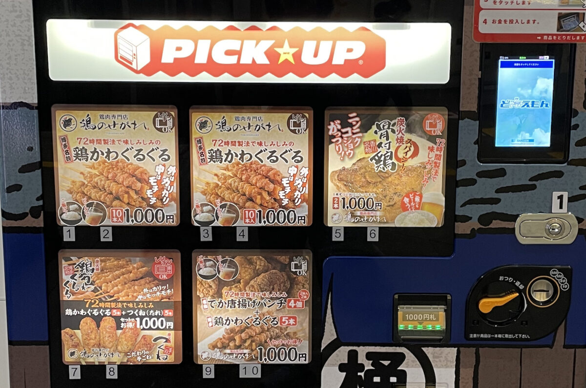 竹ノ塚駅構内にある自動販売機コーナーのラインナップをお伝えします。 2024年5月4日時点の情報です。 鶏かわぐるぐる、炭火焼骨付鶏 ラーメン、餃子各種(亀戸餃子、おけ似等) クレープ、マカロン 馬刺し、馬肉さくらユッケ 刺身(鯛、サーモン
