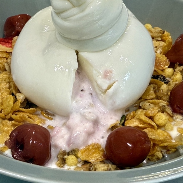 こちらのチーズは大手乳業ならではの技術を駆使してお家に帰ってからも楽しめるということでした。明治が手掛けるお店で一番の人気チーズが十勝できたてブッラータ(1500円)。他にもバジルやトリュフをまぜたものも人気とのこと。ペロッと食べられるということでした。生クリームがたっぷりと入っています。