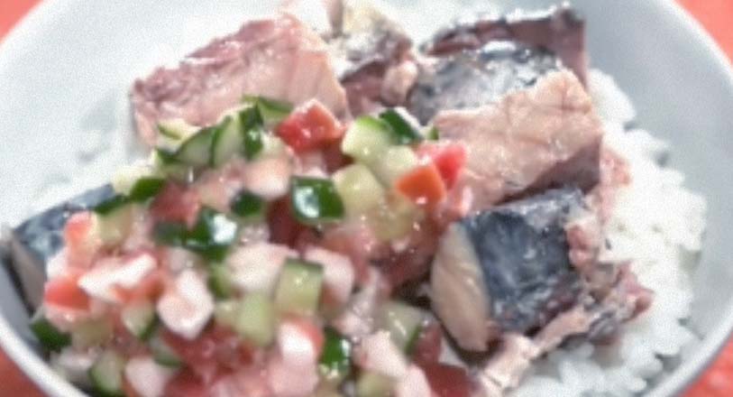 - 器にご飯を盛り付け、その上にサバの水煮をのせます。