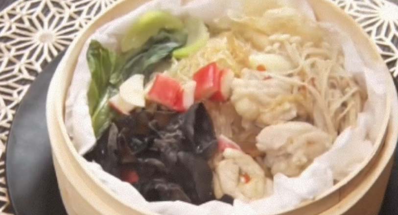 - 蒸し上がったらふたを取り、全体をよく混ぜ合わせます。春雨が長くて食べにくい場合は、キッチンバサミで適当な長さに切って完成です。