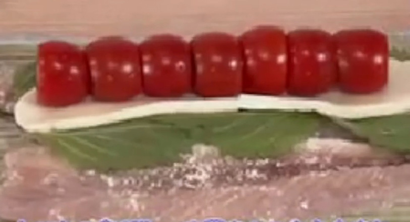 3. 大葉、スライスチーズ、トマトを順にのせ、巻きすで巻いて形を整えます。