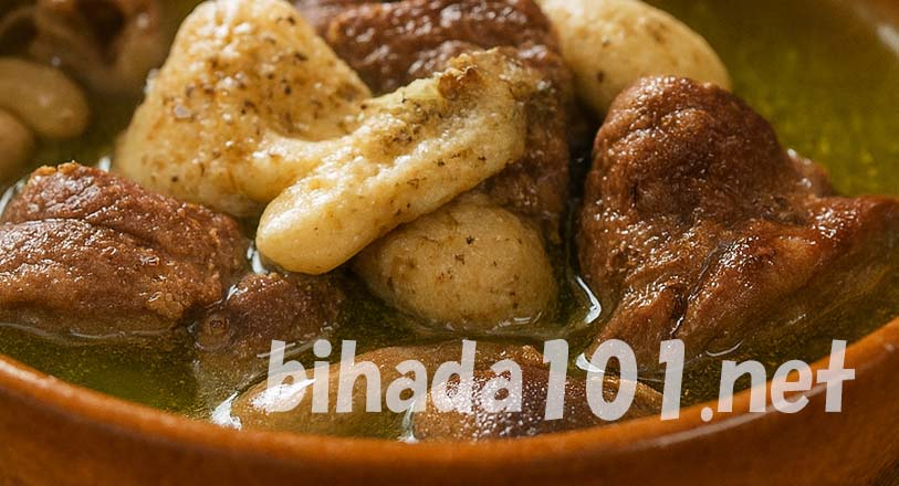 - 鍋にオリーブオイル、塩、ニンニクを加えて加熱して沸騰させ、モツを入れます。