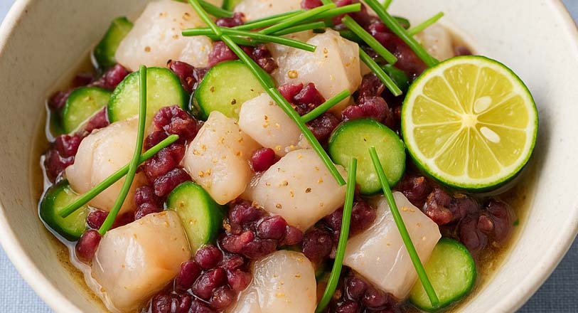 しば漬けの酸味と香りが刺身の旨みを引き立て、すだちの爽やかな香りが全体を引き締めてくれます。オリーブオイルとしょうゆの組み合わせが和洋折衷で白ワインにもよく合い、おつまみにもぴったりの一品でした。手軽に作れるのに華やかで、おもてなしにもおすすめです。