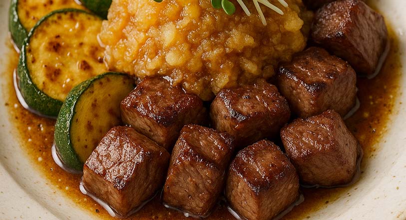 表面は香ばしく中はジューシーなサイコロステーキに、出汁の旨みが効いたおろしソースが最高に合います。鬼おろしの粗い食感と玉ねぎの甘みで後味はさっぱり。ズッキーニの香ばしさが良いアクセントで、白ワインにもごはんにも合う万能メインでした。