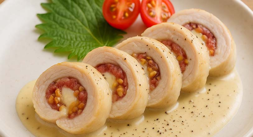 - 鶏むねロールを食べやすく切り、皿に盛ってソースをかけ、黒こしょうをふります。