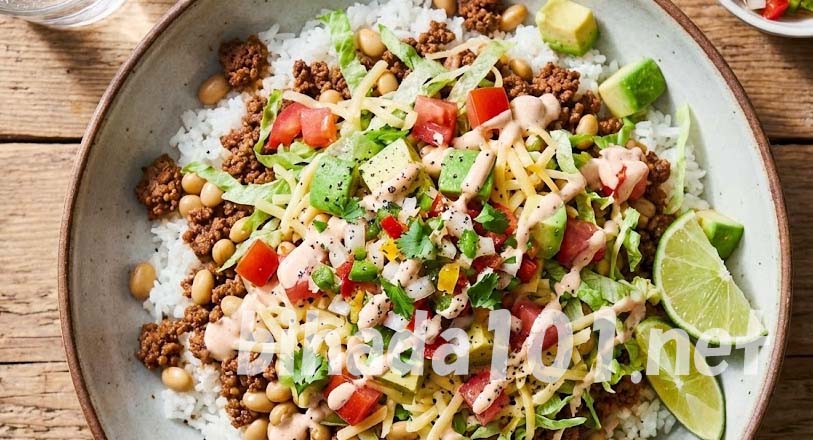 - 器にご飯を盛り、その上にタコミート、水気をしっかり絞ったレタス、アボカドをバランスよくのせます。仕上げにサルサソースとシュレッドチーズをたっぷりとかけたら完成です。