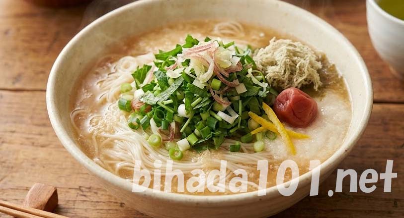 - お好みで、とろろ昆布、ゆずの皮、梅干しをトッピングすれば完成です。