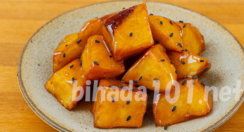 - 熱いうちに焼き芋を加えて全体にタレをからめます。