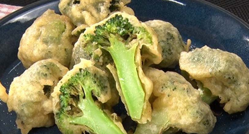 - 170℃の油で約3分揚げ、衣がカリッとしてブロッコリーの緑色が鮮やかに残るうちに油からあげます。