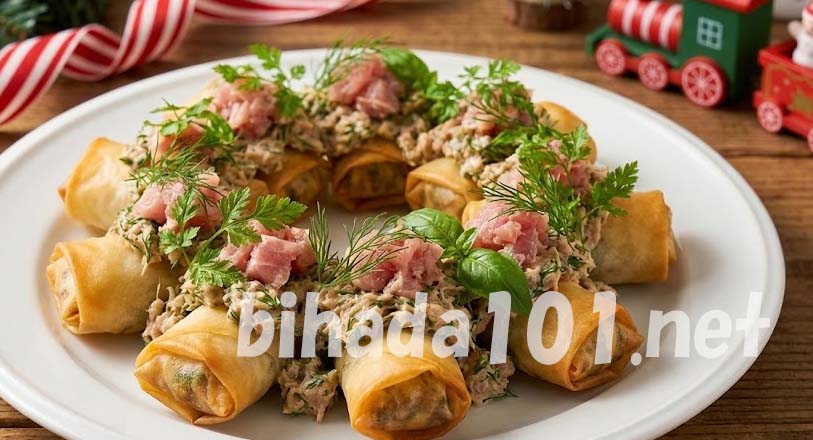 - ①で作ったソースを春巻きの上にのせ、ディルやセルフィーユをトッピングしたら完成です。