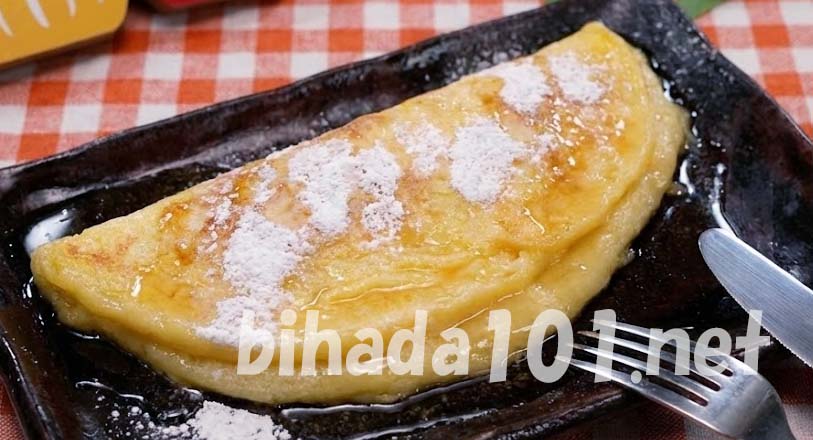 - フライパンにバター(10g)を入れて中火で溶かし、作った生地を流し入れます。フタをして弱火で5分間じっくり焼いてください。表面にぷつぷつと気泡が出てきたら、フライ返しで半分に折りたたみます。