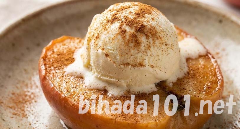 - 焼き上がったりんごを器に盛り、熱いうちに中央のくぼみへバニラアイスをたっぷりと一盛りずつのせます。